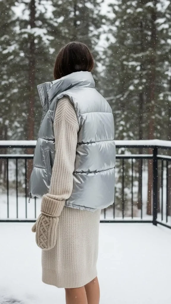 A silver puffer vest over a knit dress mixes sporty sparkle and warmth. It’s a great combo for chillier days when a full coat feels too heavy. Choose a neutral knit dress you already own to keep it budget-friendly. Add simple gloves or mittens to finish.