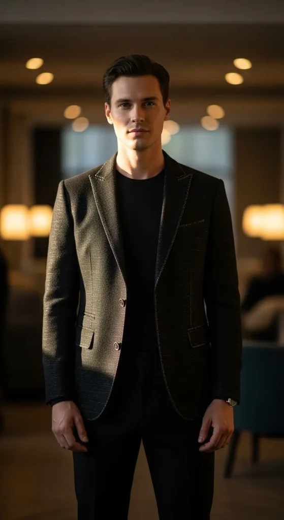 Head-to-toe black is easy and always sharp. Use a black tee or button-up with slim black trousers. The blazer becomes the hero piece, so keep everything else simple. This works well for late-night events or dinner parties. Add a metallic watch or ring for a hint of shine. If you want extra dimension, choose different fabrics—matte trousers with a slightly textured blazer. This outfit is quick to assemble and doesn’t require buying new items if you already own basic black pieces.
