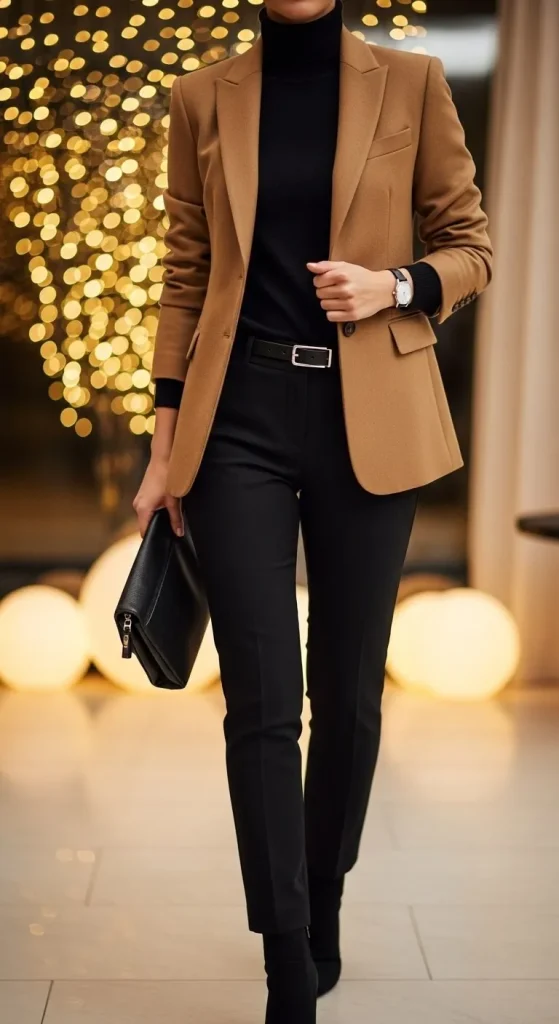 Camel adds warmth to winter outfits. Pair it with all-black layers to keep things clean. A black turtleneck or tee works well. Add black trousers or denim. You can find affordable camel blazers at outlet stores or second-hand shops. Keep accessories simple—black watch, black boots. This outfit works for both daytime and evening events. The contrast makes the look stand out without feeling dressed up.
