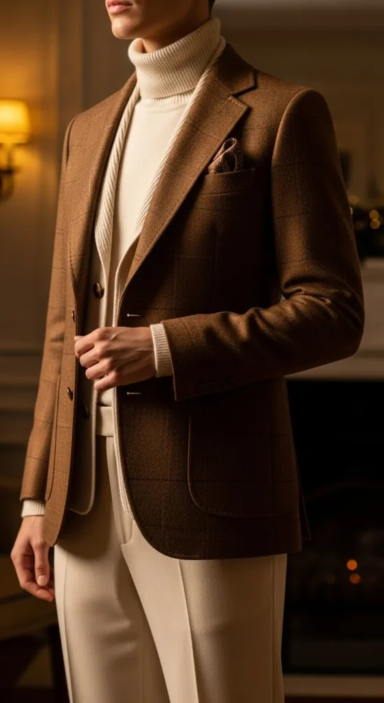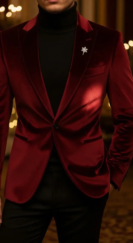 A navy blazer always looks clean and modern. Pair it with a black turtleneck for a smooth, winter-ready look. Keep trousers slim so the outfit stays sharp. You don’t need expensive knits—any soft black turtleneck works. Add a simple watch and dark loafers. If you want a small touch of holiday style, pick a pocket square with a hint of silver. Re-use the same turtleneck with other jackets to save money. A lint roller and a quick steam can make the whole outfit look freshly styled without paying for tailoring.