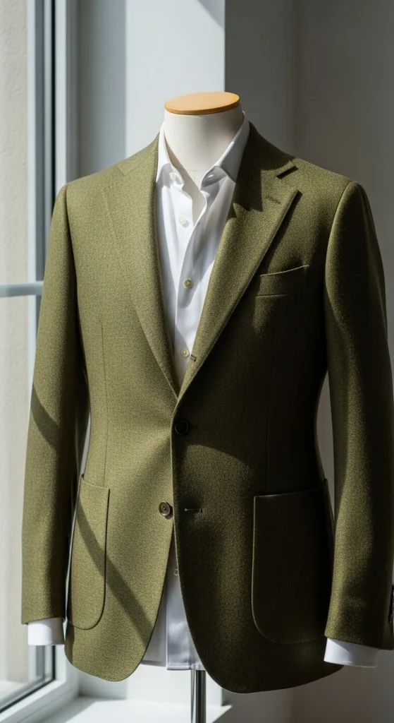 Olive green works well in winter and pairs beautifully with white. Use a simple white button-up and dark trousers. Keep accessories brown or black depending on your shoes. This outfit feels calm and season-appropriate. You can reuse the white shirt for many outfits, making this cost-effective. If the olive feels flat, add a brown belt to bring warmth.