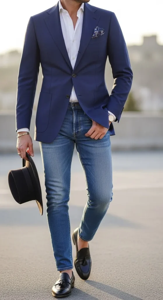 A deep blue blazer pairs surprisingly well with light denim. This creates a relaxed but polished outfit. Keep the top simple with a tee or button-up. You can wear sneakers or boots depending on the event. This is ideal for low-key gatherings where comfort matters. Stick to jeans without heavy distressing so the outfit stays smart.