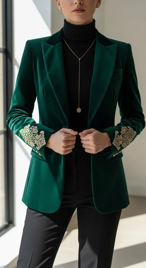 A velvet blazer instantly feels evening-ready. Pick deep colors like black, navy, or wine. Keep the base outfit simple—plain tee or clean button-up. Velvet catches light, so avoid heavy accessories. If you’re working on a tight budget, you can find velvet blazers in thrift stores or rental shops. Wear with black trousers and polished shoes. Skip bold prints; let the jacket handle the styling. This is perfect for dinners, parties, or end-of-year events.