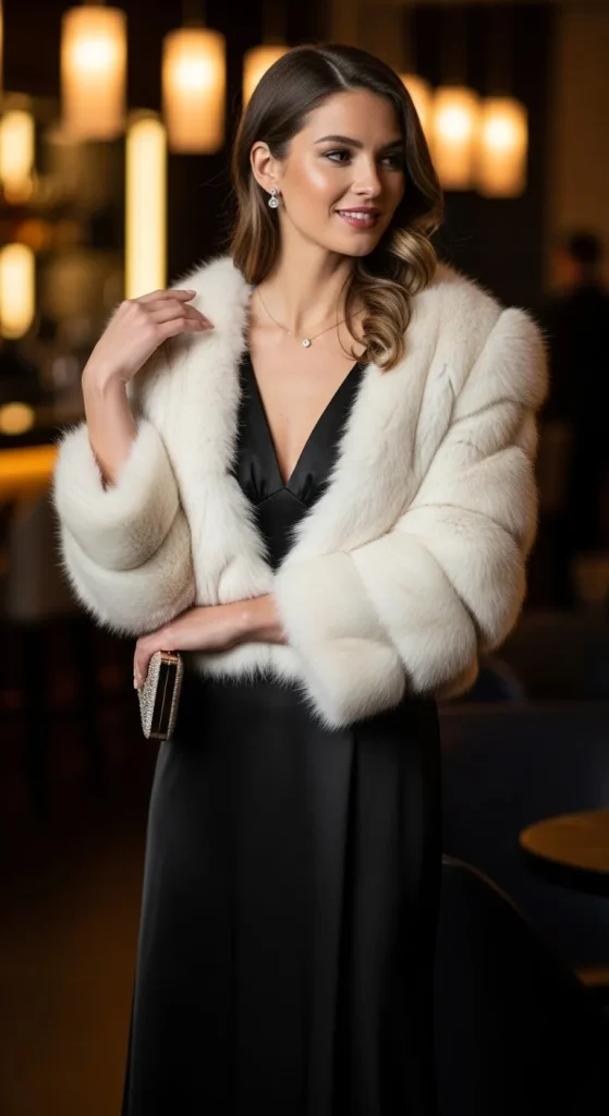 A faux fur shrug can be the perfect addition to a cocktail dress, adding warmth and texture to your outfit. It also gives a nod to vintage Hollywood glamour. Choose one in a neutral color like black, white, or gray to pair with most dresses. If you’re on a tight budget, DIY a faux fur collar and attach it to a dress you already own.