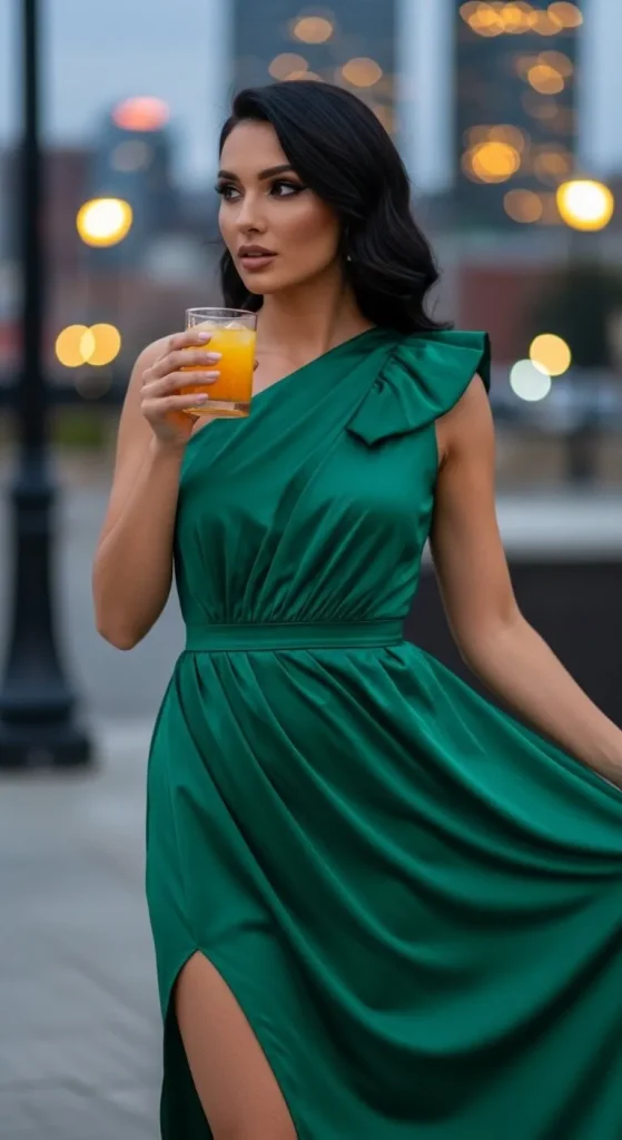 An asymmetrical one-shoulder dress is another great way to stand out. This design balances structure with fluidity, showing off your shoulders while providing enough coverage for an elegant look. Choose neutral tones like champagne or blush for a sophisticated vibe, or try vibrant colors like deep purple for added drama. Affordable options are available from retailers like Forever 21 and ASOS.