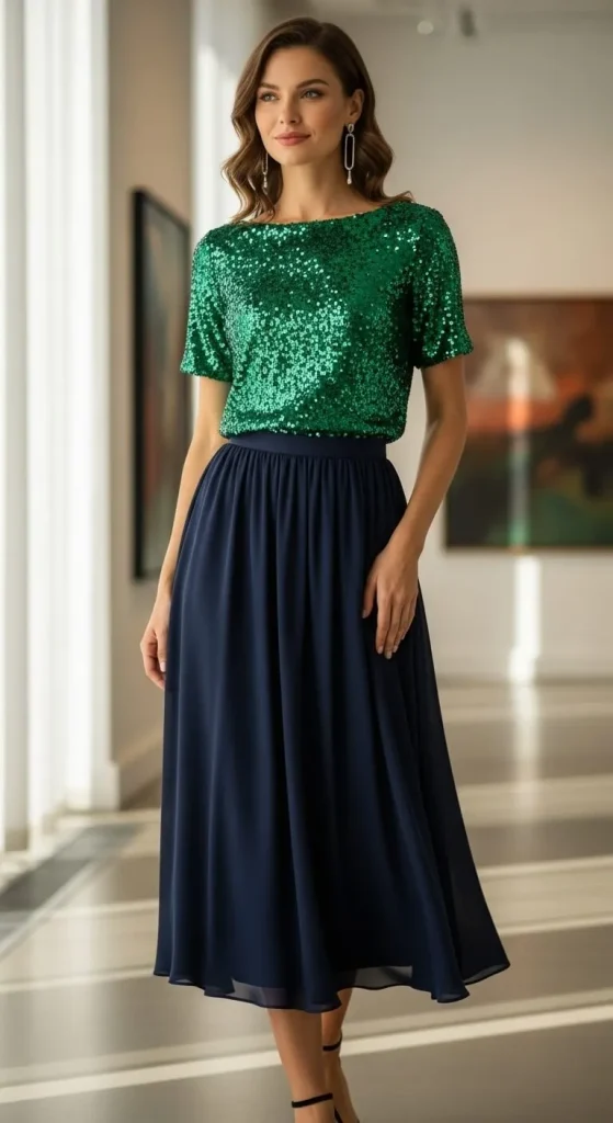 Pairing a midi skirt with a sequin top creates a balance between playful and elegant. The sequins on the top will catch the light, while the midi skirt keeps it grounded and easy to wear. You can easily find affordable midi skirts from stores like Target or ASOS.