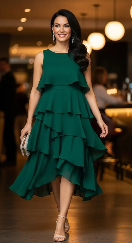 A ruffled dress adds a fun, flirtatious flair to your holiday look. The layers of fabric create movement and texture, making it perfect for twirling on the dance floor. Pair it with simple accessories, such as delicate earrings or a sleek clutch. Budget-friendly options can be found at retailers like ASOS or Urban Outfitters.
