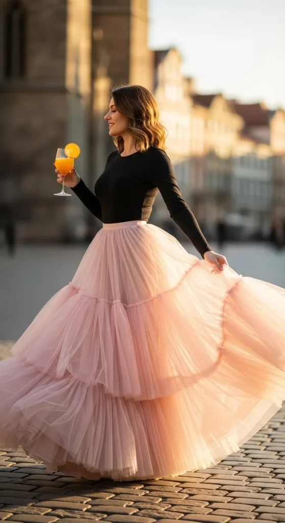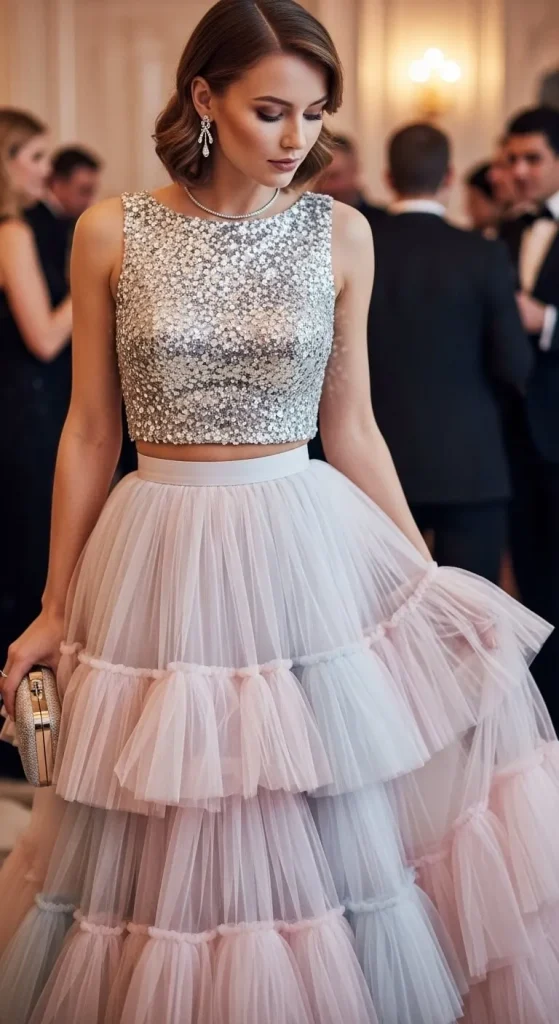 For a festive and fun look, pair a sparkly crop top with a voluminous tulle skirt. The sparkle from the top adds holiday glam, while the tulle skirt gives the outfit an airy, fairy-tale-like quality. If you’re on a budget, try to find a tulle skirt from a discount retailer and pair it with a glittery top you already own. This look is perfect for those who want to add a bit of whimsy to their evening.