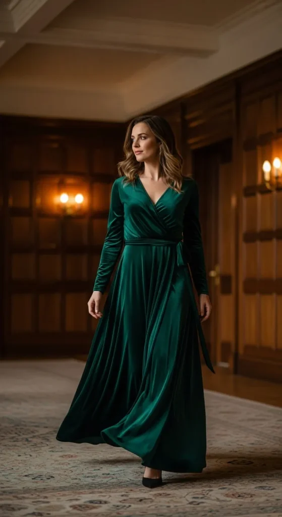 Velvet is the ultimate fabric for holiday cocktails, offering both elegance and warmth. A wrap dress in a rich color like deep red or emerald green will flatter most body types, accentuating your waist and creating a timeless silhouette. Velvet’s soft texture also feels luxurious without being over-the-top. Pair with simple metallic heels to keep the look balanced, or try a DIY version by upcycling an old dress with some velvet fabric.