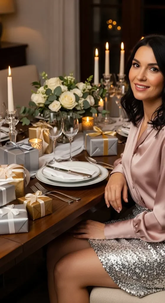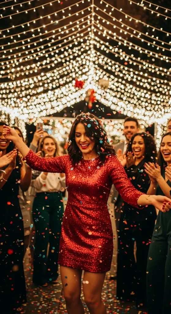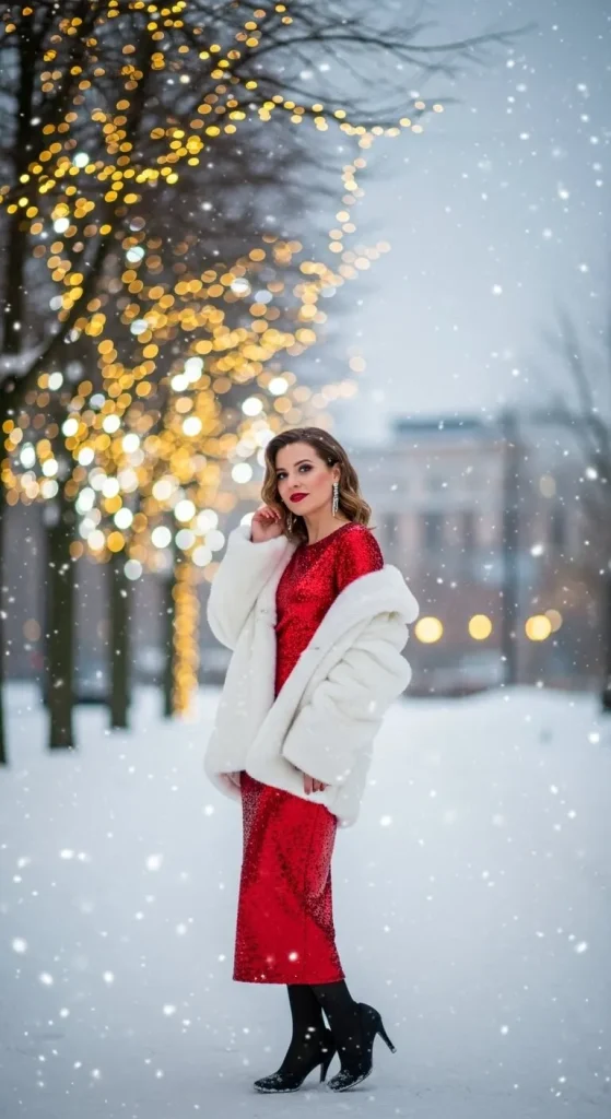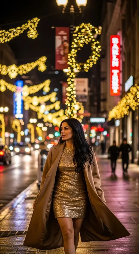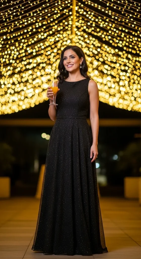 Shine bright in a silver sequin dress — perfect for New Year’s Eve. To keep it balanced, pair it with neutral accessories like a white clutch or clear heels. Add a faux fur shawl if you’re attending an outdoor event. If you’re on a budget, find an affordable sequin dress online or DIY one by stitching small sequin patches onto a plain dress.