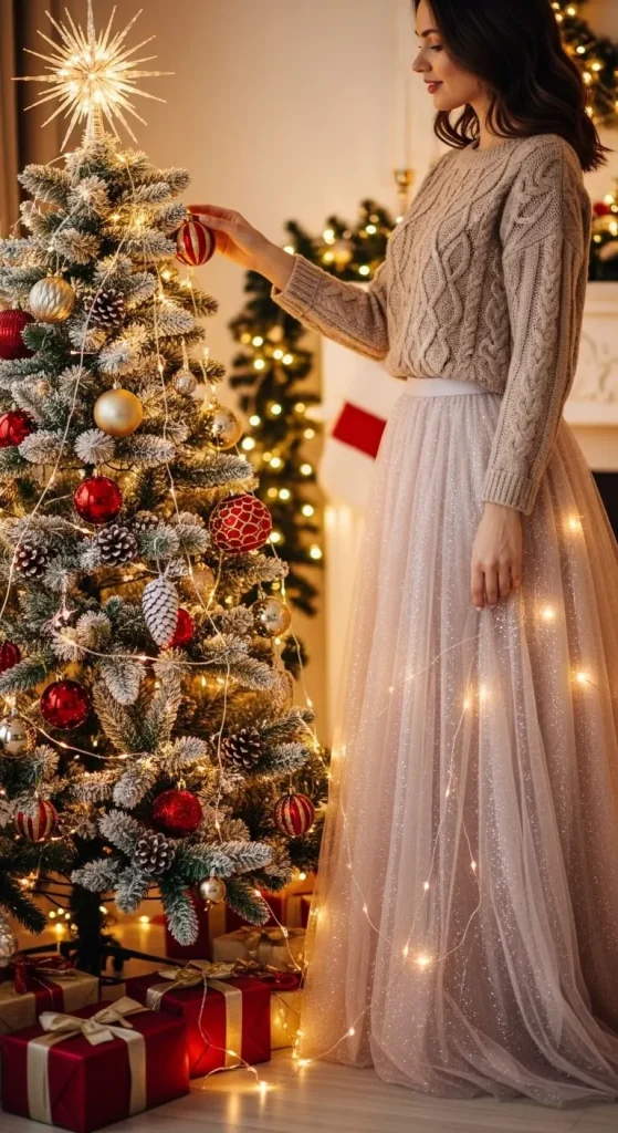 Mix cozy and glam by pairing a soft sweater with a sparkly tulle skirt. Add ankle boots or sneakers for casual parties. DIY the skirt using glitter mesh fabric — it’s easy and affordable.