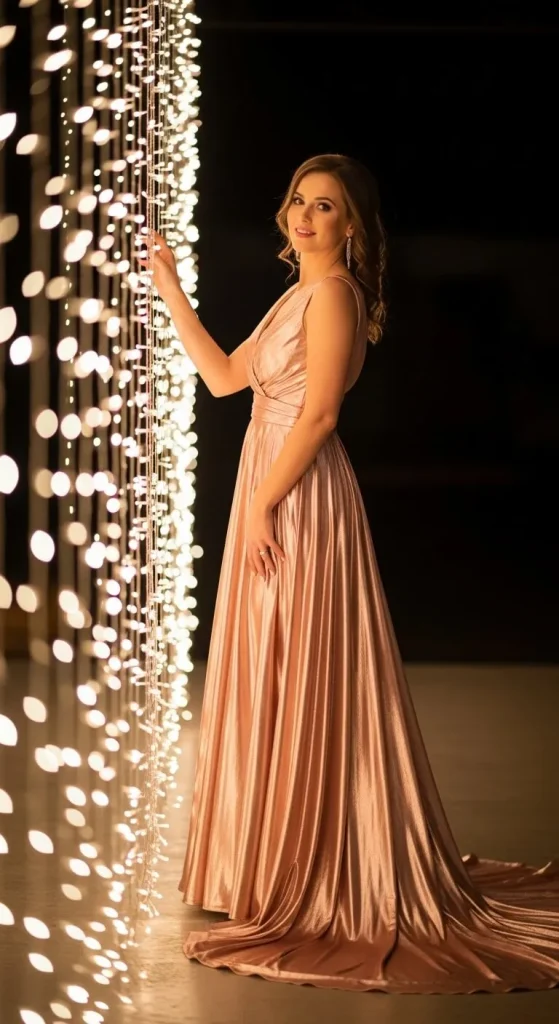 Rose gold adds warmth and glow. Keep accessories soft — nude clutch and pastel makeup. Tailor an old pink gown with metallic spray fabric paint for a DIY rose gold look.