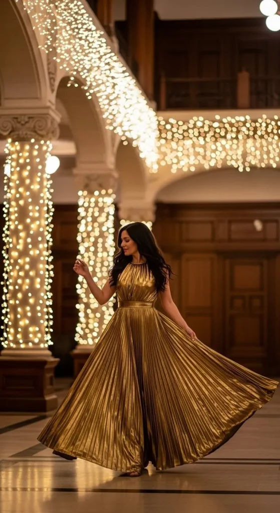 The gold pleated dress feels regal and fits every celebration. Pair it with delicate jewelry and nude pumps. A thin belt can define your waistline. For a budget-friendly take, buy metallic fabric and ask a local tailor to create a simple pleated design.