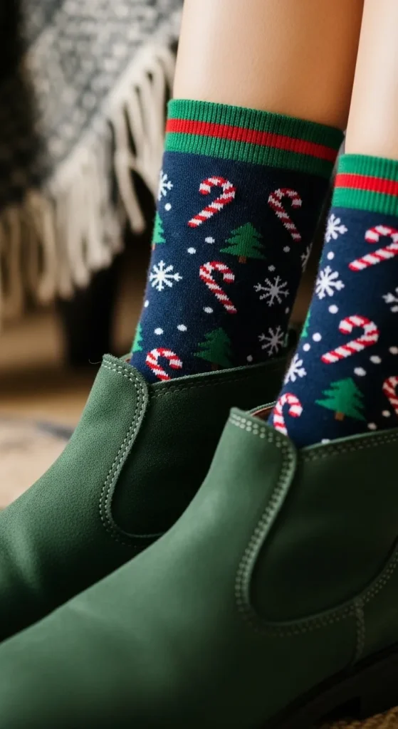 Who says accessories have to be expensive? Holiday-themed socks are a playful way to add some festivity to your outfit. Whether they’re adorned with snowflakes, candy canes, or reindeer, these socks can add a touch of whimsy. Go for a bold pattern or stick with classic red and green.