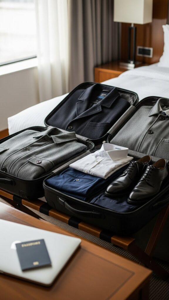 Holiday business travel doesn’t need a complicated wardrobe. These outfits keep your luggage light and your options flexible. Repeat colours, choose comfortable fabrics, and build outfits you can wear from airport lounges to evening dinners without changing your whole look. A few strong pieces give you a polished, practical travel wardrobe every time.