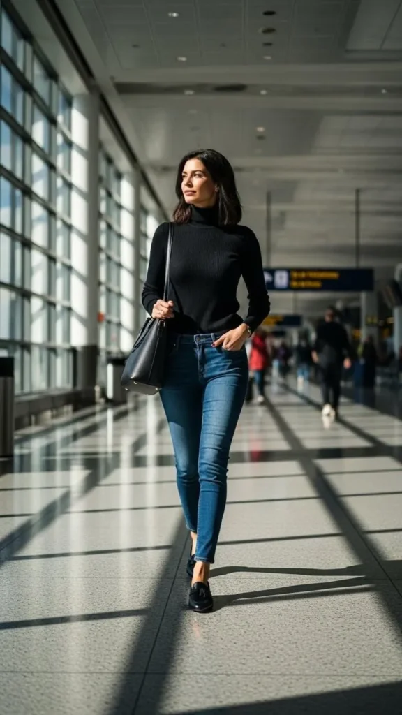 A black turtleneck and slim trousers work for almost any business-holiday situation. The pieces fold easily, take little space, and pair with almost every outer layer. Add a small pendant or stud earrings to keep things polished. Choose wool-blend trousers for cold weather or ponte fabric for comfort on long flights. If the outfit feels plain, drape a patterned scarf over your shoulders. It adds interest without making your bag heavy. For shoes, stick with loafers or low ankle boots that match everything. If your turtleneck wrinkles easily, hang it in the bathroom while you shower to let the steam fix it quickly.