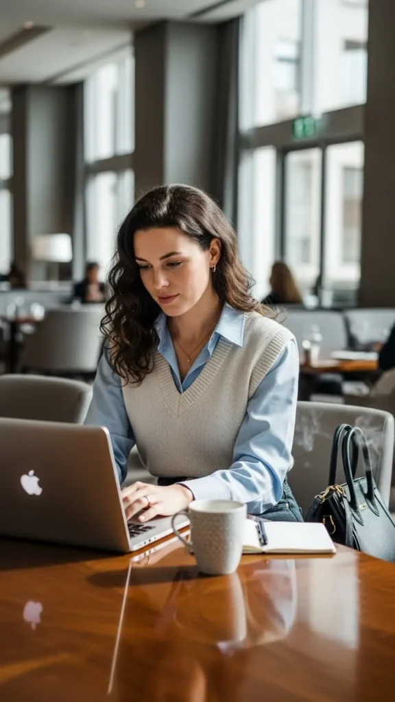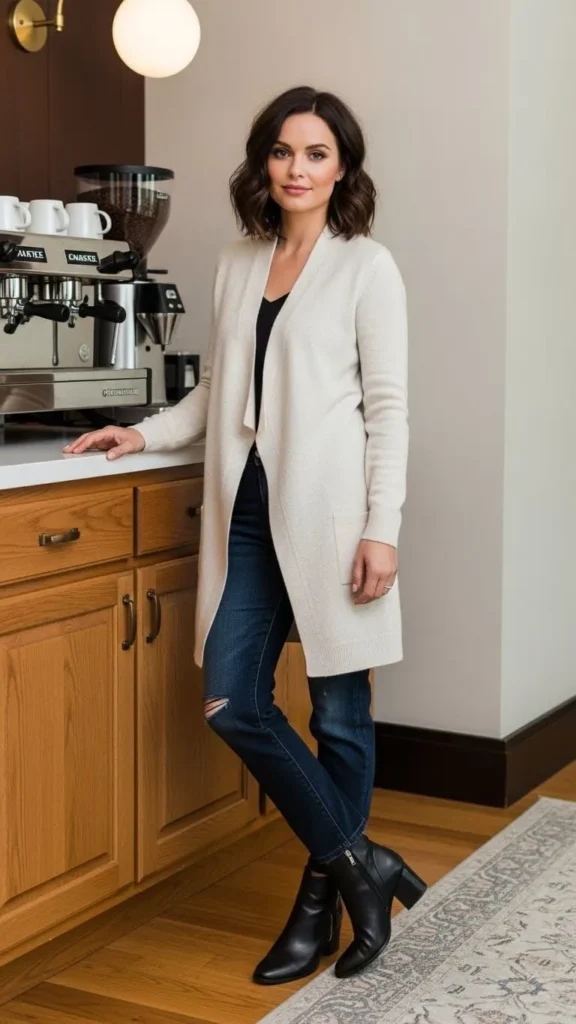 A longline cardigan feels like loungewear but looks organised enough for informal business moments. Choose dark straight-leg jeans for a clean base that works with almost any top. Add a simple v-neck tee or lightweight sweater underneath. For meetings, swap the cardigan for a structured blazer you packed. Keep a pair of leather ankle boots to tie the whole outfit together. Roll jeans at the hem to avoid dragging if you’re wearing flats. This look is ideal for travel days, hotel workspace hours, and casual client catch-ups.