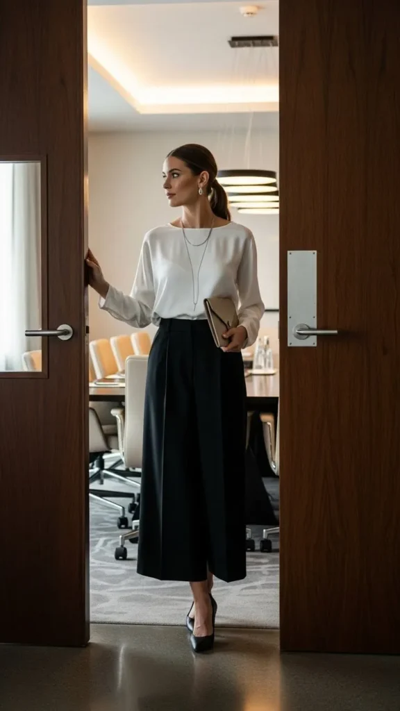 Tailored culottes look polished and allow easy movement. Pair them with a minimalist blouse in satin, silk blend, or crisp cotton. Choose muted tones for a professional appearance. This outfit works in both warm and cool destinations. Add block heels or pointed flats for length. Culottes pack small and match many tops, keeping your wardrobe organised.