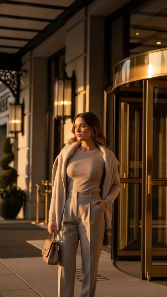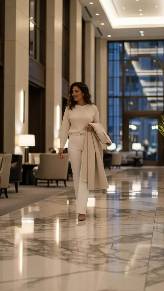 A tonal layering set looks organised even on rushed days. Pair matching trousers with a top and cardigan in the same shade. Add a contrasting coat for depth. Tonal outfits photograph well, which helps for work events or team gatherings. Bring one neutral set so you can re-wear it with different accessories during your trip.