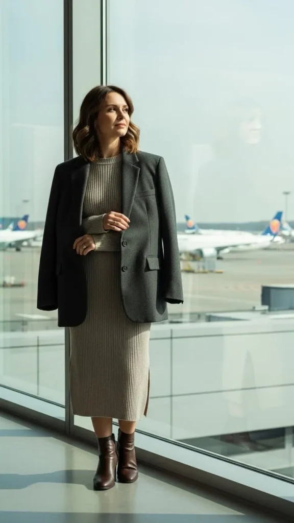 A knit dress keeps you comfortable through flights and still looks polished at the hotel check-in desk. Add an oversized blazer for a structured look that works for work dinners or quick coffee meetings. Choose a midi length so you stay warm and avoid adjusting it while moving around. A belt can change the shape if you want more definition at the waist. This outfit handles both flats and heeled ankle boots, which makes packing easier. Roll up the blazer sleeves for a casual touch during travel days. To keep your dress from stretching, fold it instead of hanging it in your suitcase.