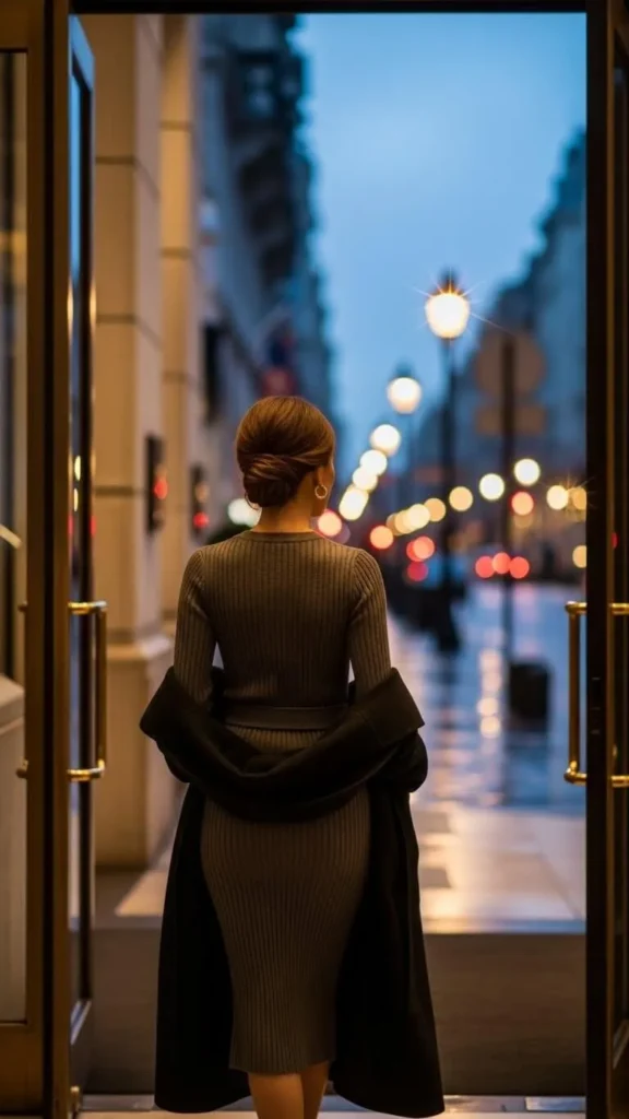 A ribbed knit dress is warm, flattering, and low-maintenance. Layer it with a belted coat to add shape. Stick to black, grey, or taupe for work settings. Add ankle boots or heeled boots for dinners. If the dress feels plain, pair it with a patterned scarf. Ribbed knits rarely wrinkle, which makes them great for quick trips.