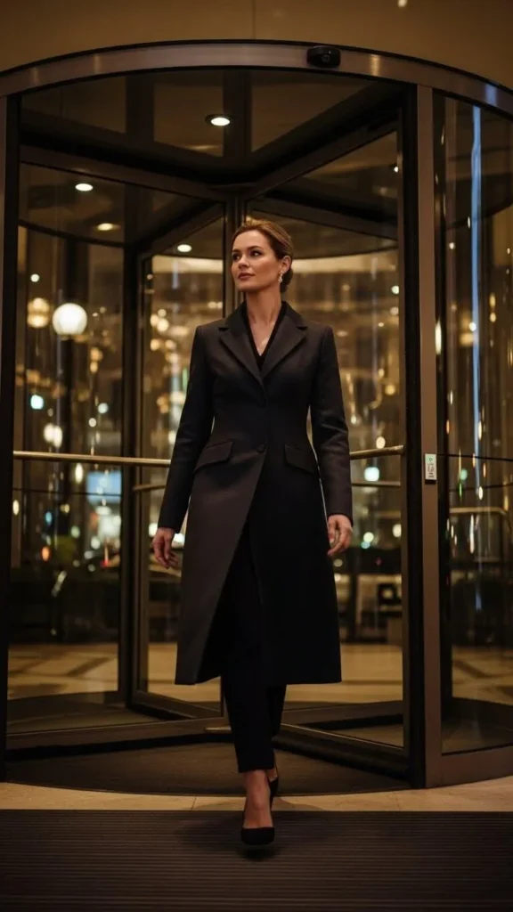 An all-black base is simple and compact. Wear black trousers and a fitted top, then add a long structured coat in camel, grey, or navy. This instantly looks polished for business travel. Add a scarf if you want a little colour. The monochrome base also helps when you’re rushing and need a put-together outfit fast. If your coat wrinkles during travel, use steam from a hot shower to smooth it.