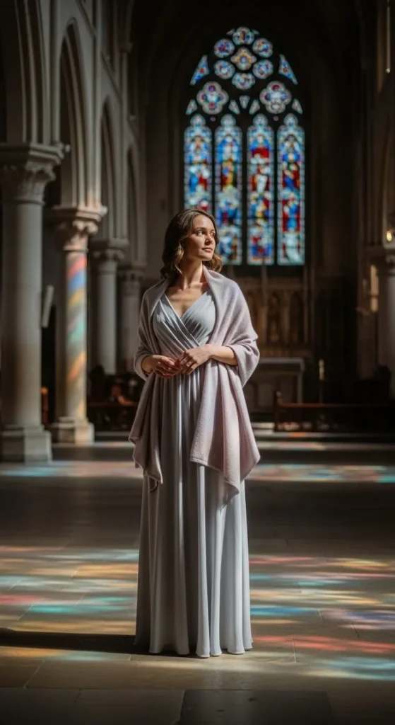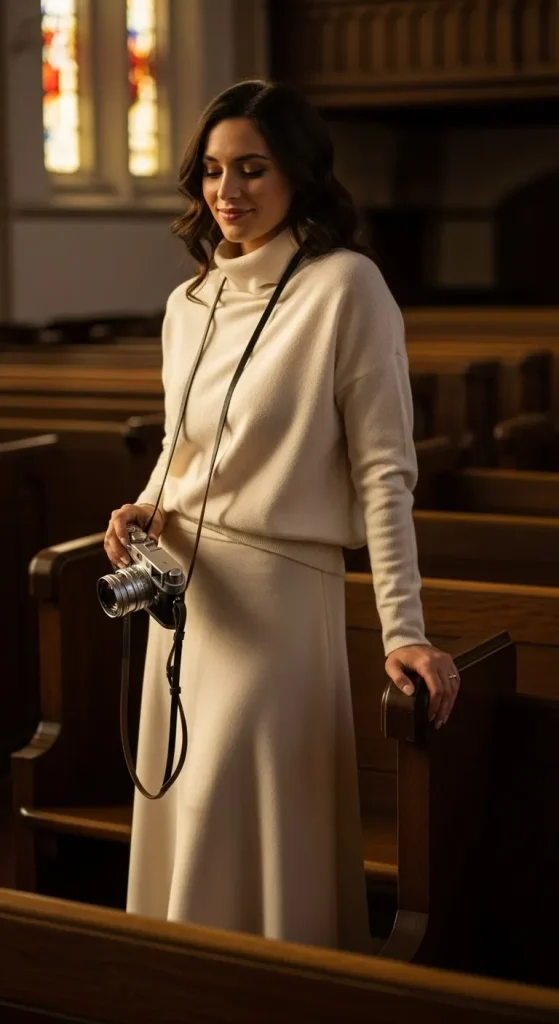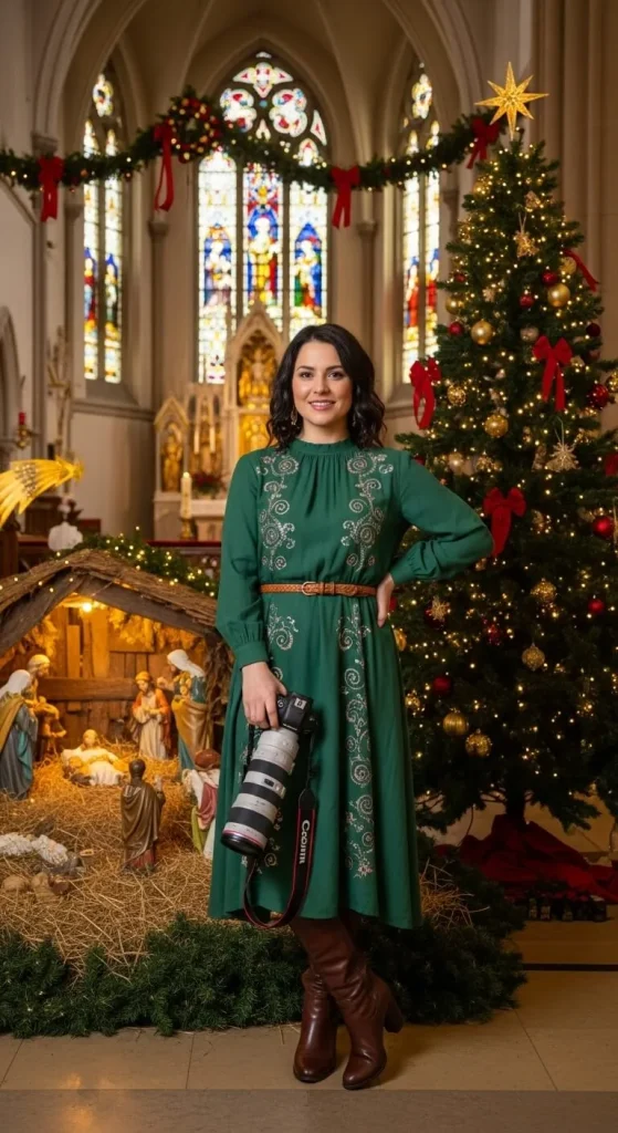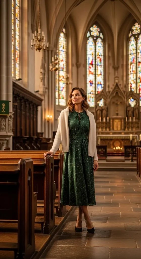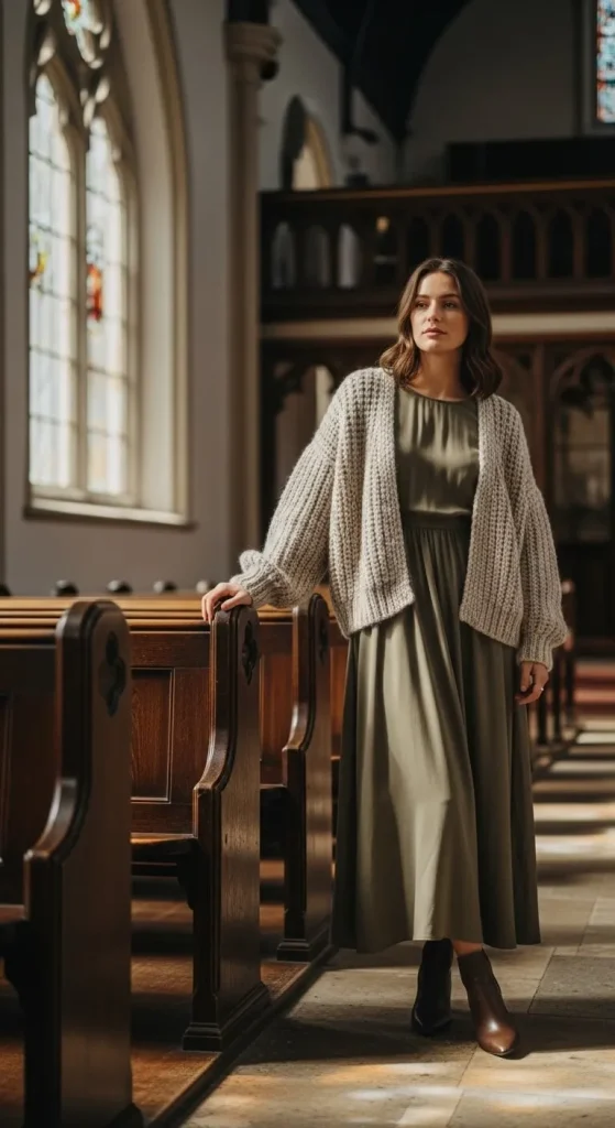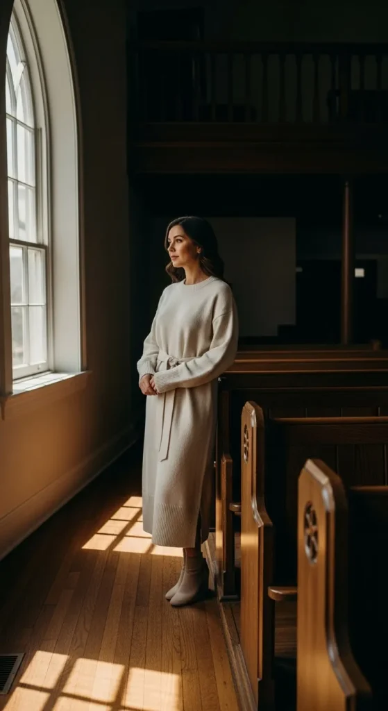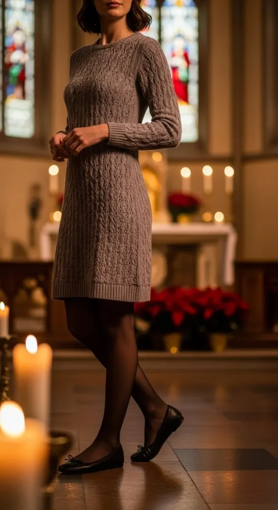 A sweater dress gives warmth while staying modest. Choose one with a longer hem and relaxed sleeves. Add a belt to shape the waist without feeling tight. Pair it with dark tights for winter. If you want a quick DIY touch, wrap a scarf around your shoulders for extra coverage. You can use a belt you already own to avoid spending more. This outfit works well for families attending Christmas morning services or candlelight nights.