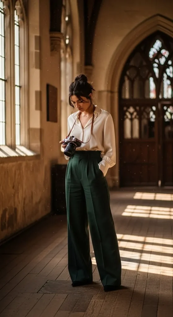 A buttoned blouse paired with wide-leg trousers looks classy and modest. Choose soft fabrics like chiffon or cotton blends. Keep the blouse tucked or half-tucked for a relaxed style. Add flats or low block heels for comfort. If you’re saving money, pick any neutral pair of trousers and match it with a blouse you already wear to work. Add a simple handbag and you’re ready for a polished holiday look that still feels calm.