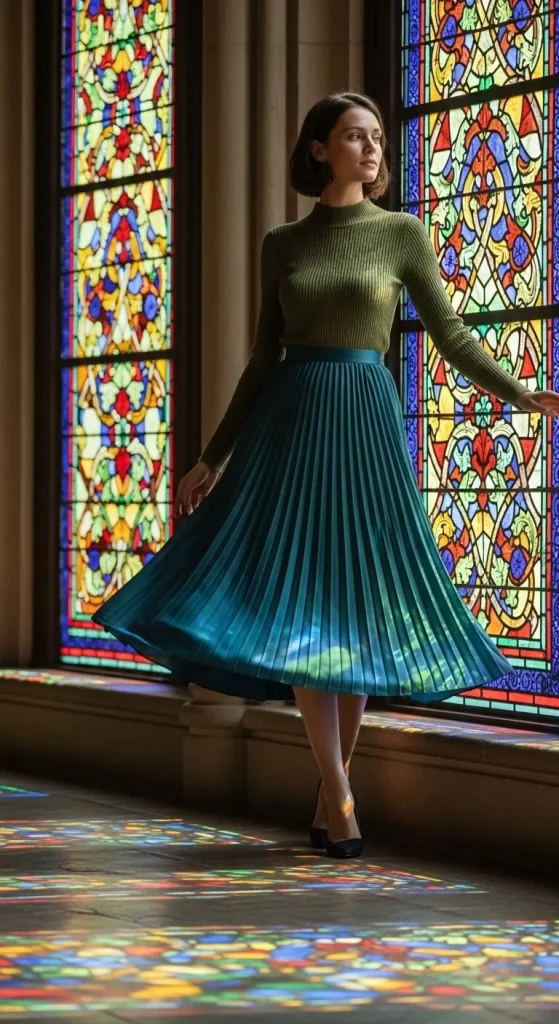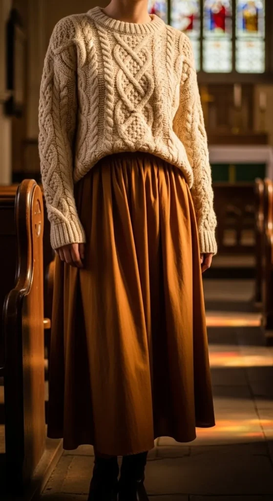 A pleated skirt adds movement without feeling flashy. Pair it with a fitted long-sleeve knit top to create balance. Tuck in the top for clean lines. You can warm it up with tights if the weather is cold. For a wallet-friendly trick, repurpose any pleated skirt you wear to work and match it with a simple sweater. Add a thin belt if you want structure. This outfit stays modest yet polished for both morning and evening services.