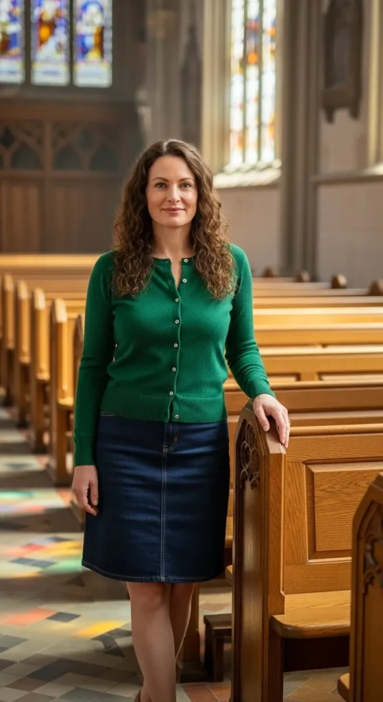 A dark denim skirt can work well if it’s simple and longer in length. Pair it with a buttoned cardigan for modest style. Add a plain tee underneath if you want more layers. Use boots or flats based on weather. For a no-cost option, reuse an old denim skirt and match it with a cardigan from your winter wardrobe. This combo feels casual but still church-appropriate.