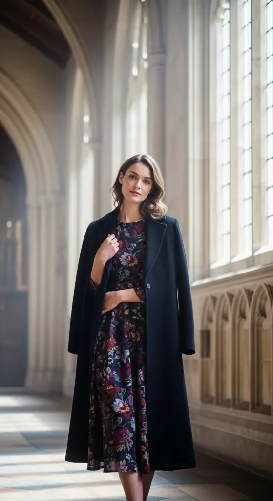 A dark floral midi dress brings quiet pattern without being bold. Layer a long coat on top for warmth. Add tights if needed and simple flats or boots. For a budget option, reuse any floral dress and tone it down with a neutral coat. Add small studs or a thin bracelet. This outfit feels calm and polished for holiday gatherings.