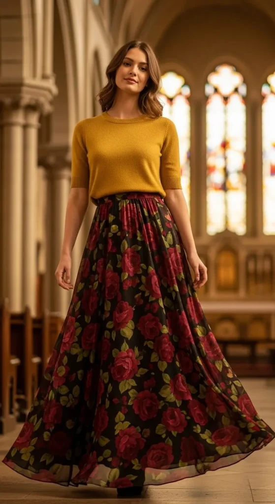 A knit top tucked into a maxi skirt feels comfortable and modest. Pick soft tones and simple patterns. Add a belt if you want structure. You can repurpose a knit top you already own and match it with any long skirt. Add comfortable shoes and a small crossbody bag. This outfit works well for longer church services where comfort matters.