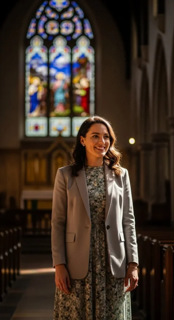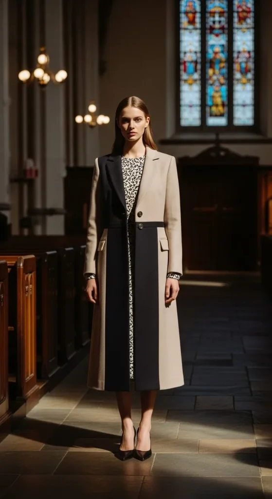 A long coat gives warmth and creates a clean silhouette. Wear it over a simple dress for church. Keep colours coordinated so the outfit flows. Add a scarf if needed. You can use your everyday coat; focus on pairing it with a tidy dress underneath. Closed-toe shoes make it complete. This look works well when the weather is cold but you still want something that feels polished.