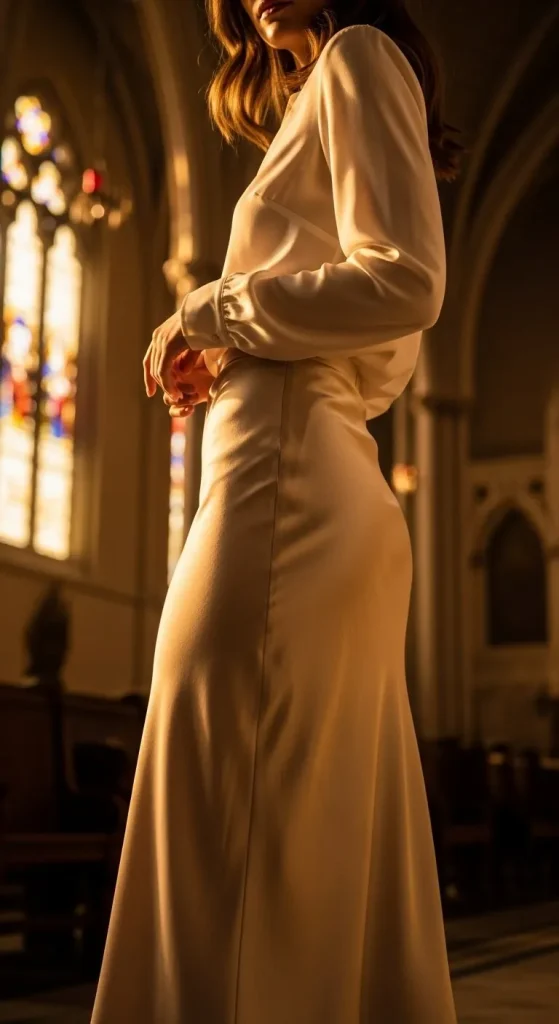 A slip skirt paired with a long-sleeve blouse feels gentle and stylish. Choose soft fabrics that drape well. Add a cardigan if you want more warmth. For affordable styling, pair any satin-like skirt with a blouse from your everyday wardrobe. Add flats or heeled boots. This look works nicely for holiday music nights or family services.