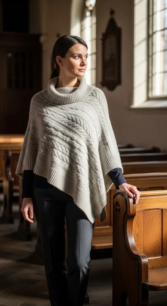 A poncho gives coverage while still looking chic. Pair it with slim-fit trousers to balance shape. Stick to calm colours like grey, camel, or cream. Add ankle boots or flats. You can recreate this look using an oversized scarf styled like a poncho to save money. This outfit works well in cold weather and still feels tidy for church.