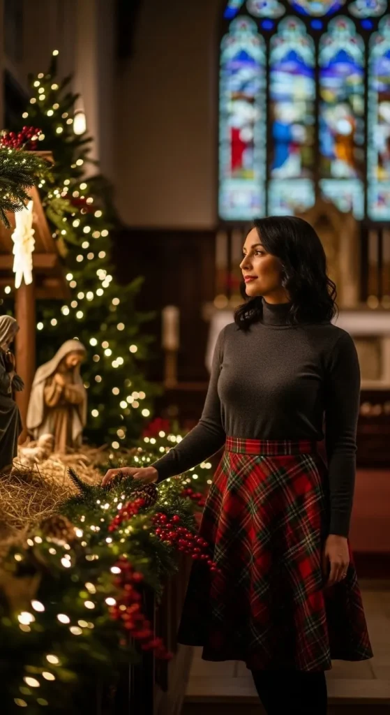 A turtleneck keeps you warm and modest, while an A-line skirt creates gentle shape. Choose neutral colours if you want a softer look, or pick deep red or green for Christmas spirit. Add ankle boots or ballet flats depending on your comfort. You can also layer a thin necklace on top of the turtleneck. A budget trick: use a solid turtleneck and match it with any flared skirt you already have. The outfit looks calm and put-together without extra shopping.