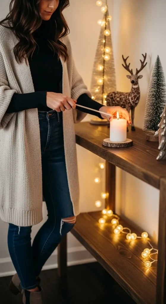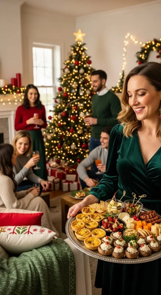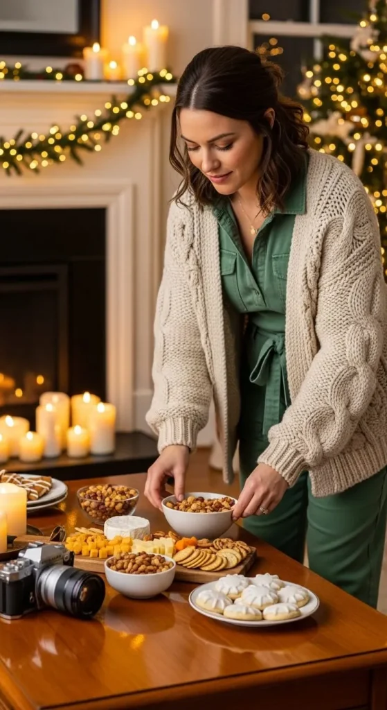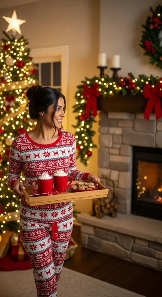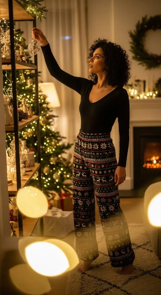 Holiday pajamas make hosting feel playful. Choose striped or plaid sets. Add fluffy socks or a matching headband. Pair red tops with plaid bottoms for a budget-friendly version. Add light makeup and a soft hairstyle. This outfit is perfect for relaxed gatherings or family-focused nights.