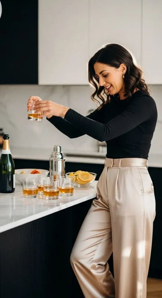 Satin pants add shine without feeling formal. A fitted top balances the wide-leg shape. Choose champagne, black, or blush satin for a soft holiday effect. Add simple gold studs. You can find affordable satin pants during holiday sales. Steam them for a smoother look. Pair with slippers or low heels. This combination is comfortable and photo-ready.