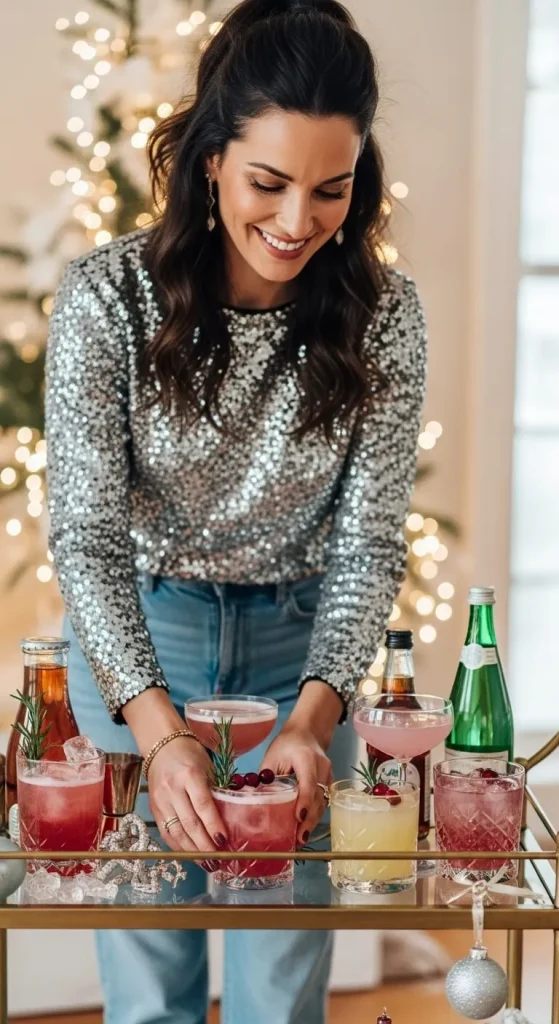 A sequin top brings instant holiday sparkle. Straight-leg jeans keep the outfit grounded. Choose sequins in silver or gold. Keep jewelry simple. You can DIY sparkle by adding crystals to a plain top. Wear sneakers or ankle boots. This outfit gives a fun holiday feel without feeling overdressed.