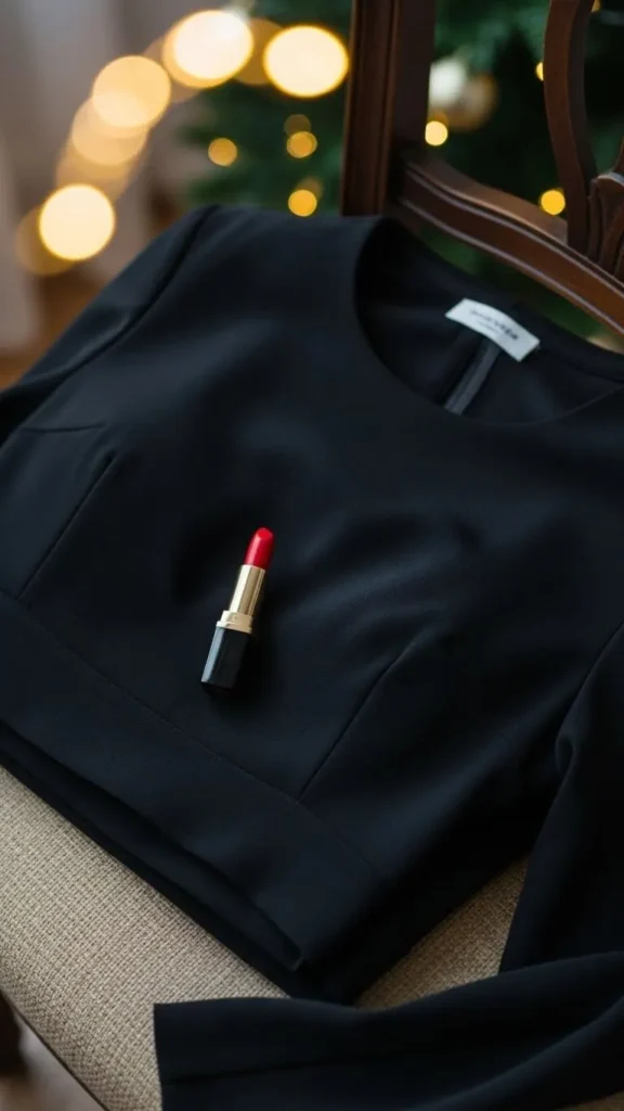 An all-black outfit is the fastest solution when you’re undecided. Choose black trousers, a jumper, or a dress. Add a bold red lip for instant holiday style. A tiny red bow hair clip can add a softer touch. Black boots or heels finish the look. This is a reliable choice for evening events or last-minute holiday gatherings.