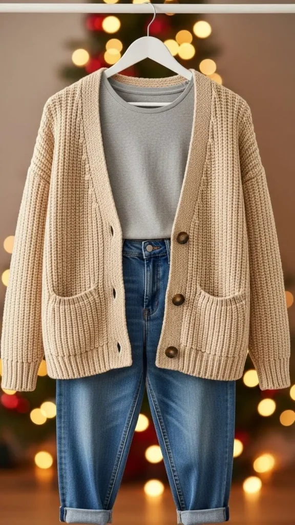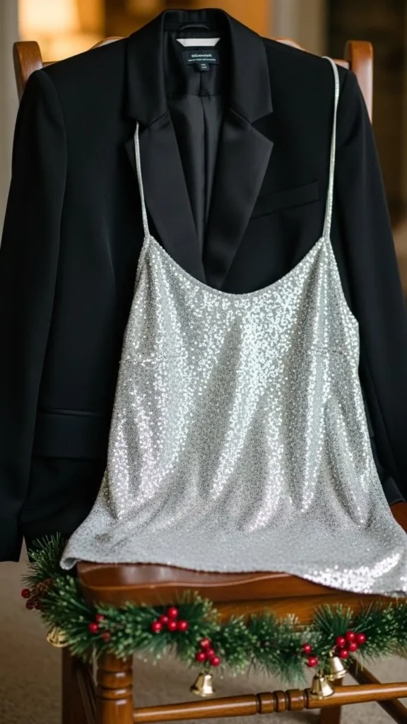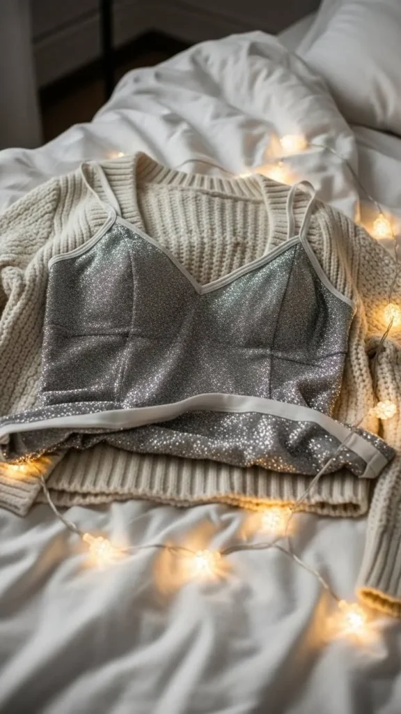 Layering makes last-minute dressing easier. A sparkly camisole under a cardigan gives you a relaxed but festive look. Wear it with jeans, trousers, or a skirt. Swap the cardigan’s buttons with gold or pearl ones for a quick upgrade. This outfit suits casual gatherings or at-home celebrations.