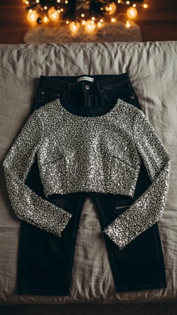 Black jeans make a quick starting point. Pair them with a sparkly top—silver, gold, or sequins you already own. This combination looks party-ready instantly. If the top feels plain, add small rhinestones with clear fabric glue. Wear ankle boots or heels. Add a simple clutch to finish the look. A blazer can make it more structured if your plans change. This works for dinners, meetups, and last-minute invites because it takes minutes to pull together.