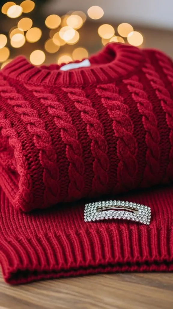 A knit set makes last-minute dressing simple. Add a sparkly hair clip or a small bow near the neckline. Wear slippers for home celebrations or boots for going out. This outfit is perfect for cosy, relaxed plans.