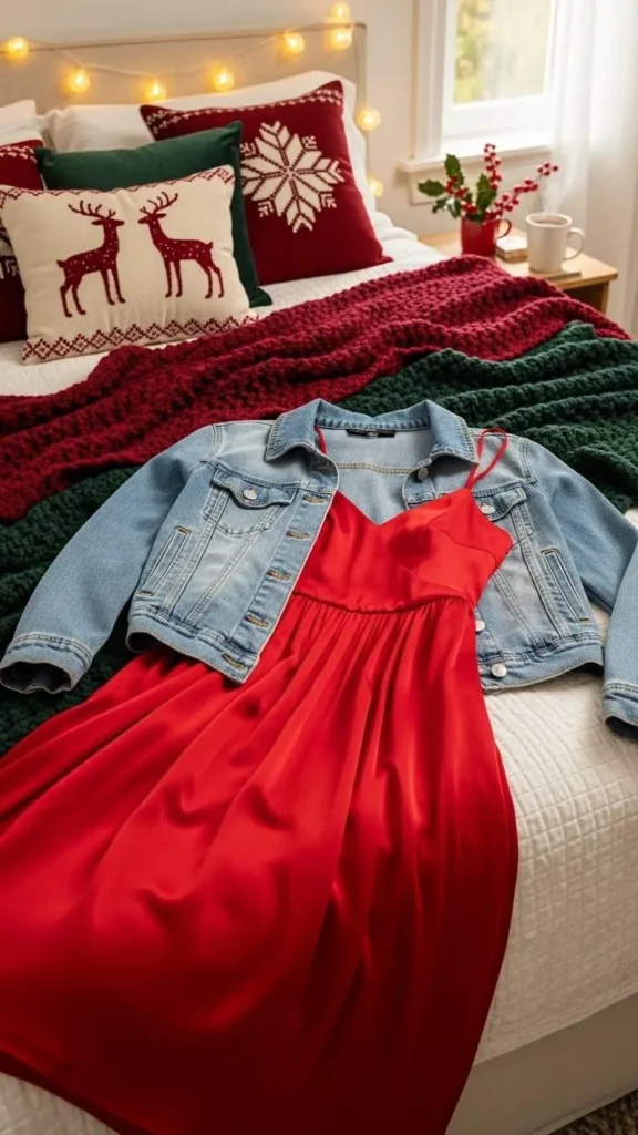 A denim jacket tones down a bold red dress and makes it suitable for casual plans. Add a small pin to the jacket for a festive touch. Trainers or boots both work. Ideal for easy, comfortable outings.