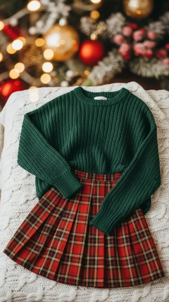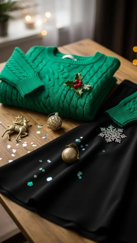 A green jumper instantly brings a holiday feel. Pair it with a black skirt, tights, and boots. Add a tiny bow or a simple brooch for detail. This outfit suits both daytime and evening plans.