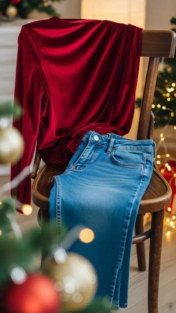 A velvet top instantly feels seasonal. Wear it with jeans for a comfortable and quick outfit. Jewel tones like navy, emerald, or burgundy work well. If the top feels plain, add a few pearls to the neckline. Finish with boots or heels. Perfect for casual dinners and evening visits.