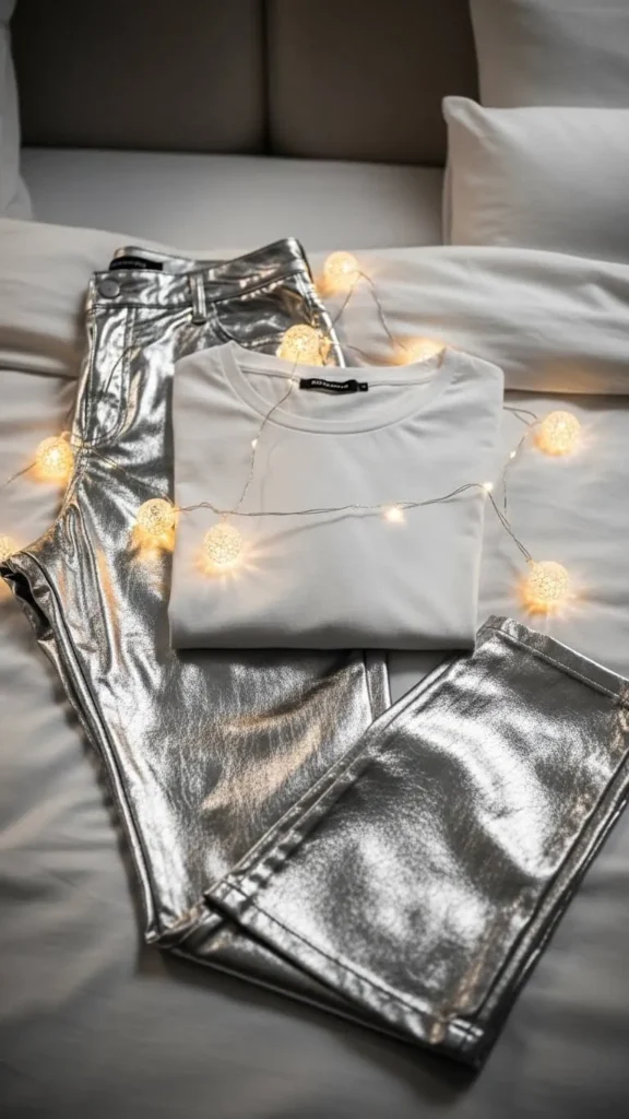 Metallic trousers give instant party energy. Pair them with a plain white or black tee. Add a simple necklace and heels or boots. This works for evening plans and last-minute gatherings where you want something bold but easy.