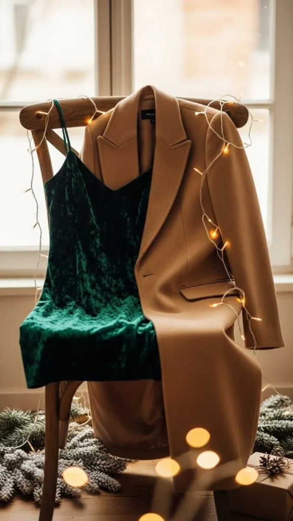 A long coat over a mini dress makes a simple, clean outfit. Choose a neutral coat for balance. Wear boots or heels. Tie a ribbon in your hair or around your wrist for a tiny holiday touch. Works well for evening dinners or outdoor events.