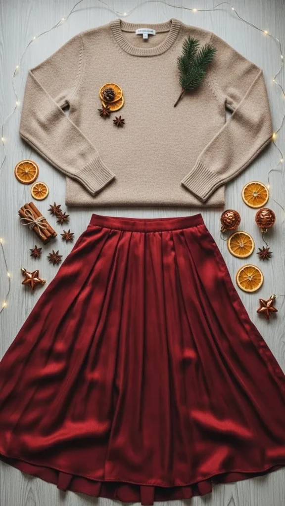 A neutral sweater and midi skirt create a soft, easy holiday outfit. Use colours like cream, grey, or beige paired with a skirt in burgundy, green, or metallic tones. Add a seasonal brooch near the neckline if you want a small touch. Boots or flats both look good. Great for daytime events.
