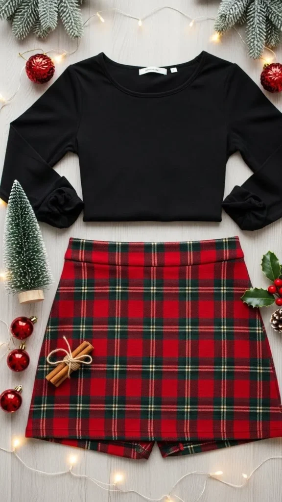 A plaid skirt always works during the holidays. Pair it with a tucked-in black top. Add tights and ankle boots. A small stitched patch at the hem can add DIY charm. This is a reliable pick for any casual holiday event.